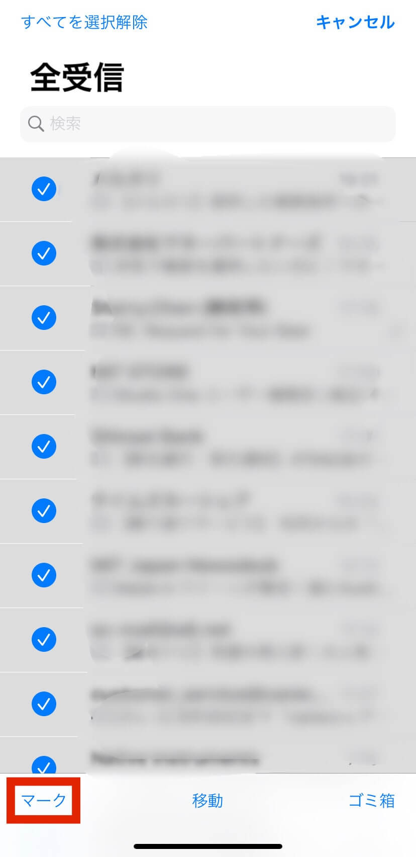 iOS13からは「編集」→「すべてを選択」→「マーク」→「開封済みにする」