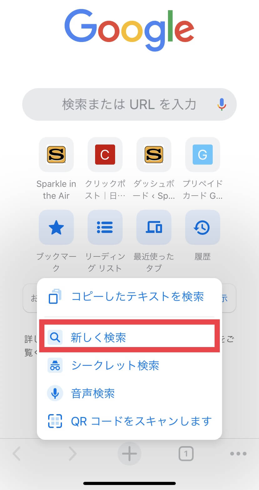 すると項目がポップアップするので「新しく検索」をタップ