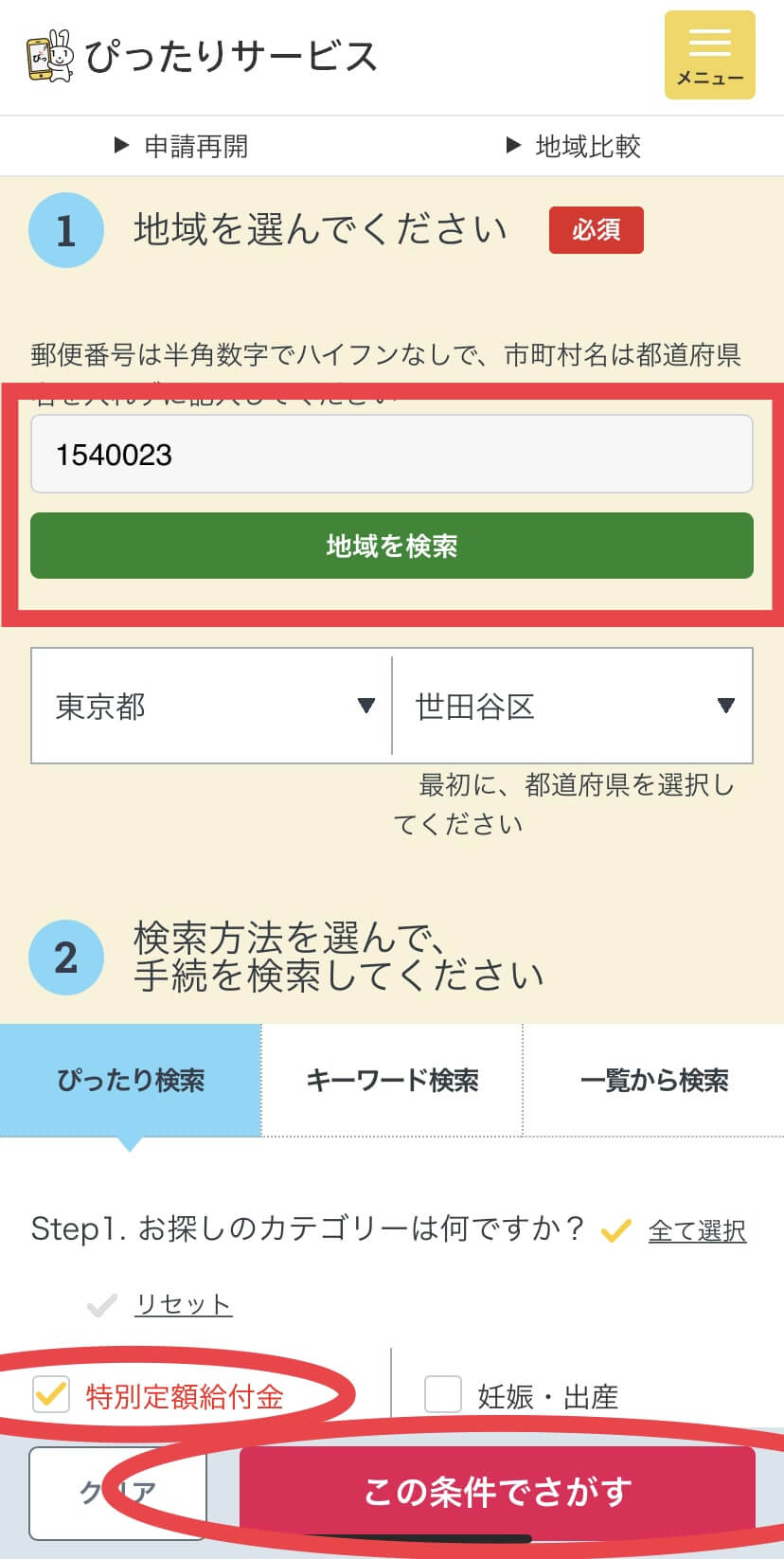 ▲自分の住んでいる地域の郵便番号を入力し、「特別定額給付金」にチェックを入れ、「この条件でさがす」をタップ