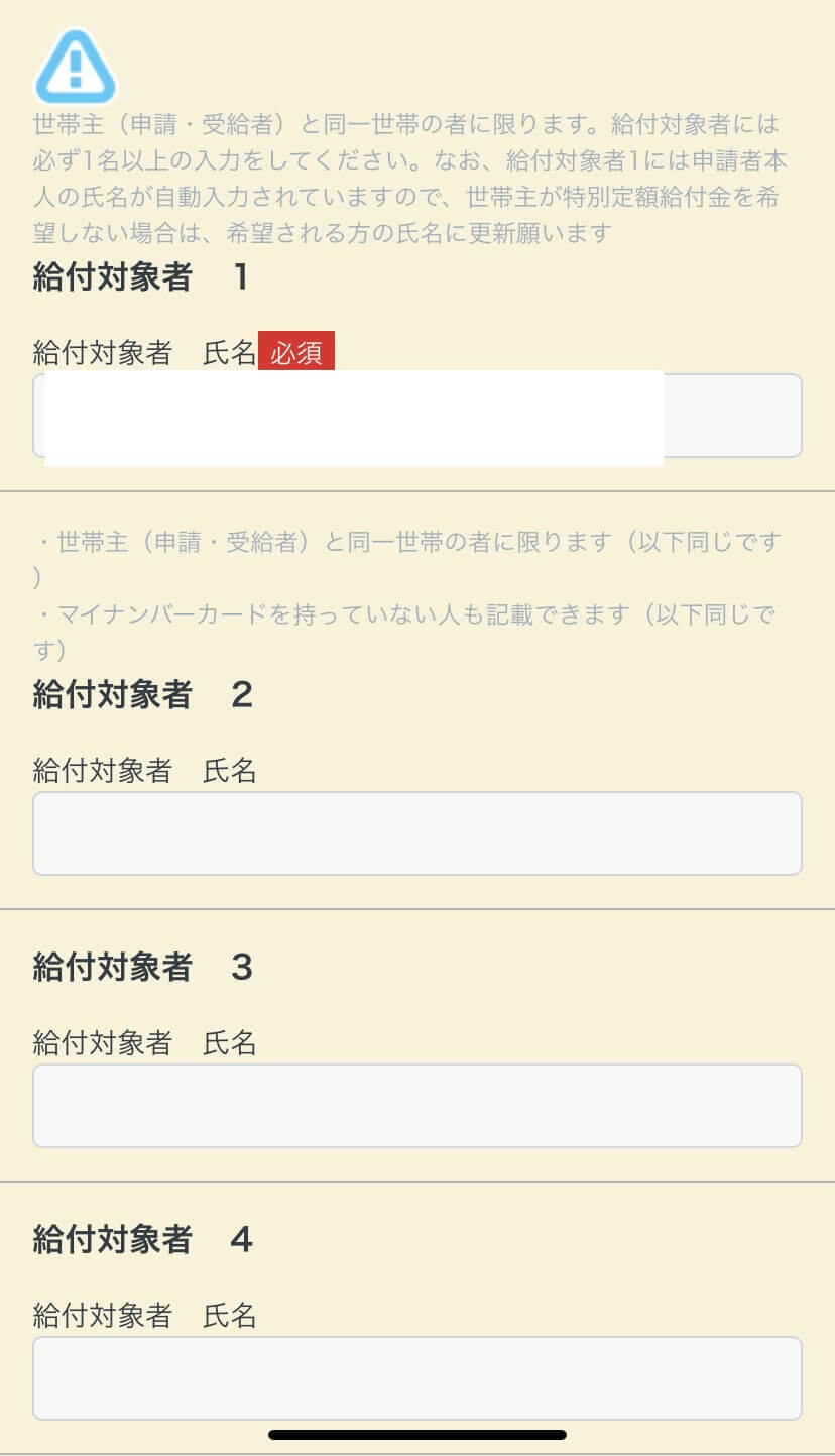 ▲給付対象者1にすでに自分の名前は入力されているので、給付対象者2以降に同居していて家計を共にしている家族の名前を入力する